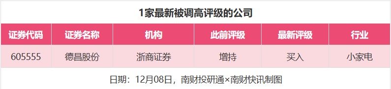 评级调高方面,12月8日,券商调高上市公司评级达到1家次,浙商证券对德昌股份的评级从“增持”调高至“买入”。