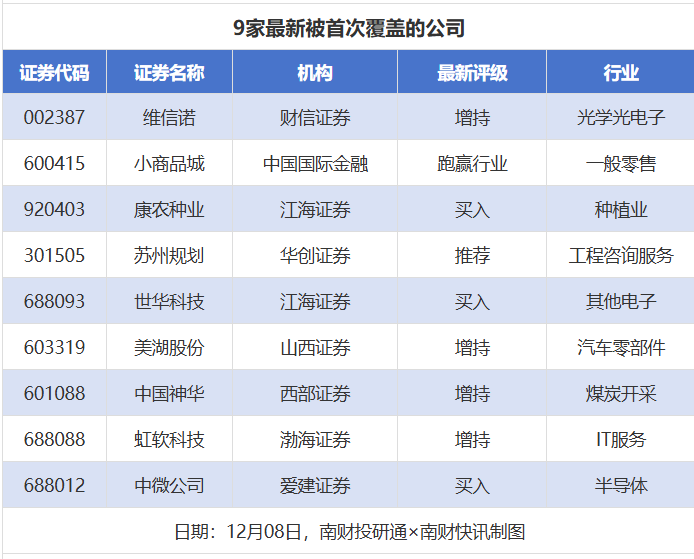 首次覆盖方面,12月8日券商共给出了9次首次覆盖,其中维信诺获得财信证券给予“增持”评级,小商品城获得中国国际金融给予“跑赢行业”评级炒股配资开户官网,康农种业、世华科技获得江海证券予“买入”评级,苏州规划获得华创证券给予“推荐”评级。