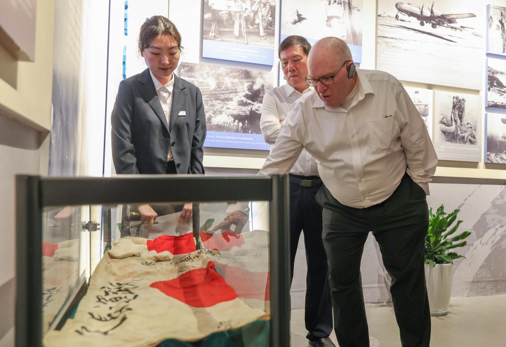 9月11日,美中航空遗产基金会主席杰弗里·格林(右)在重庆史迪威博物馆参观图片展。新华社记者 陈诚 摄