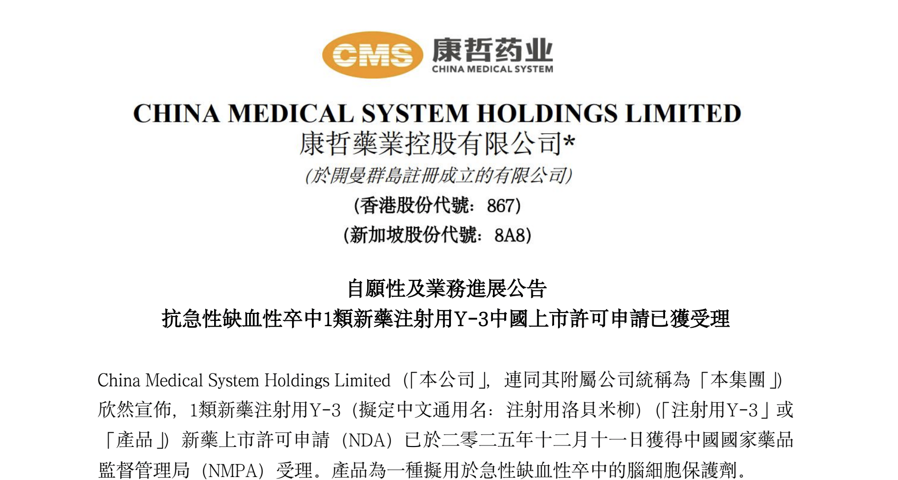 12月11日,康哲药业(00867.HK)发布公告,注射用Y-3(拟定通用名:注射用洛贝米柳)新药上市许可申请(NDA)已获得中国国家药品监督管理局受理。产品为一类新药配资知名股票配资门户,拟用于治疗急性缺血性卒中。